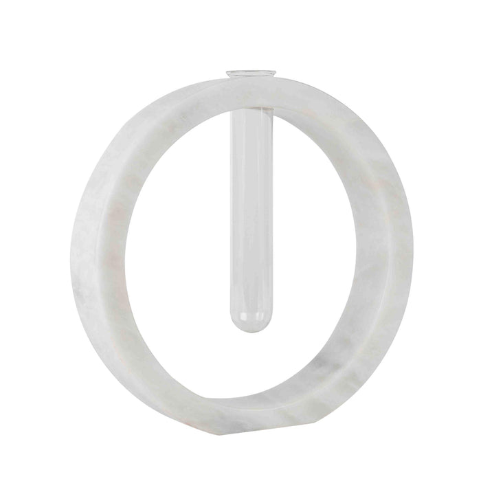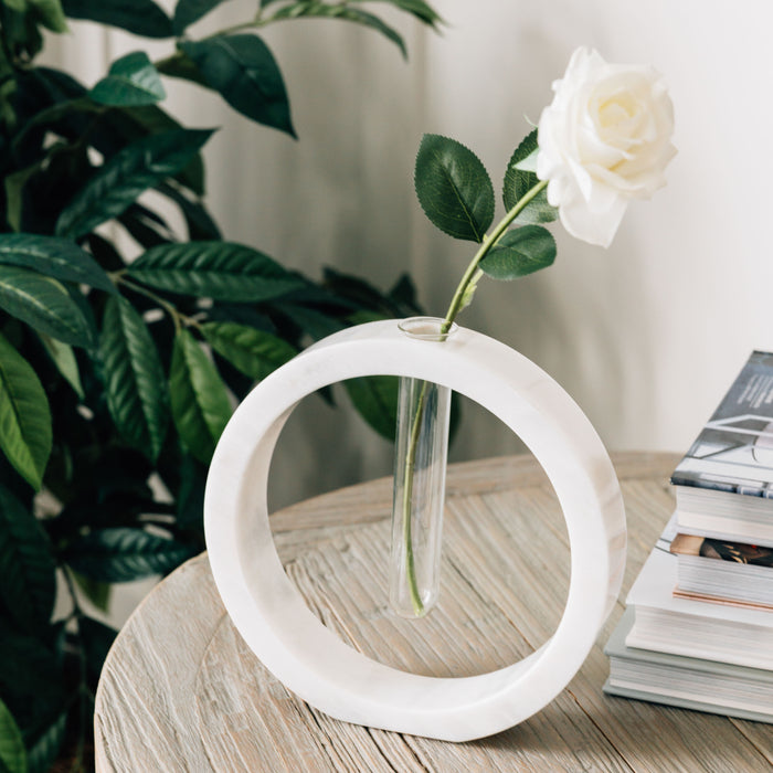 Elevate your home decor with the Akela Marble Vase. Handcrafted from white marble, this unique bud vase boasts an elegant design that adds a touch of charm. Display fresh cuttings in an eye-catching and unique way, or use this bud vase to propagate your clippings! This white marble bud vase is made by expert artisans in Pakistan. Dominion Traders employ independent onyx workshops in the city of Karachi, most of which are family-owned and operated. Each handcrafted vase is unique due to its luxurious white marble base.