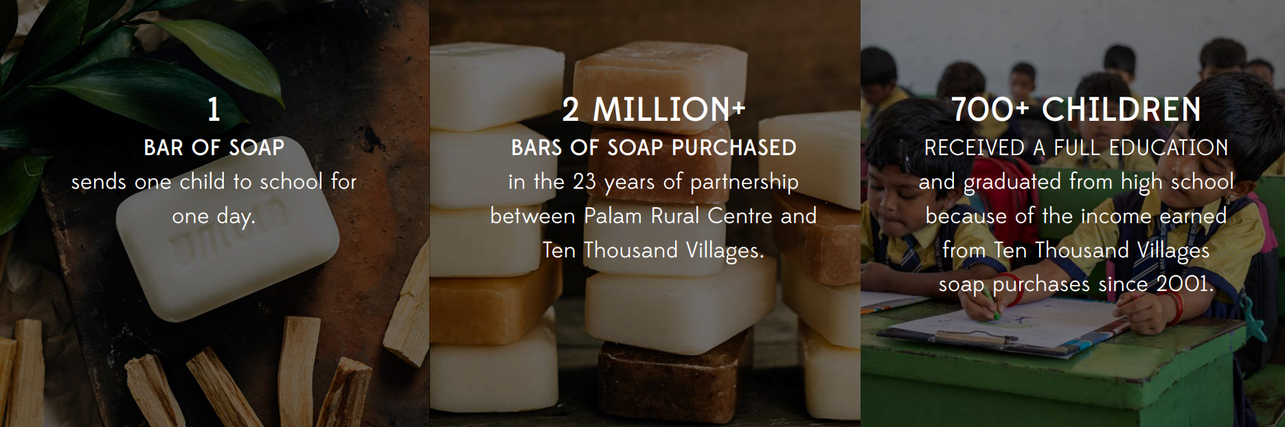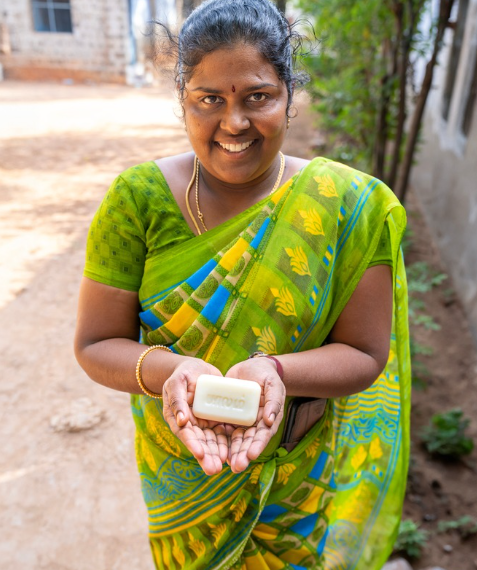Kousalya grew up in the Palam community where her father earned a living at the soap workshop, funding her degree in biotechnology. Now she proudly puts her education to use as the soap unit manager there. For this community in South India, it’s more than a bar of soap, it’s a bridge to equality. Their plant-based, eco-friendly soap funds generations of upward mobility. The word Palam stamped into each bar means bridge. With ingenuity, hard work and long-standing partners like Ten Thousand Villages, the soap makers have created a bestselling product. They have overcome discriminatory social systems and stereotypes to build an award-winning school and a sustainable, thriving community whose members are respected in society. It’s a story of shared prosperity and well-being.