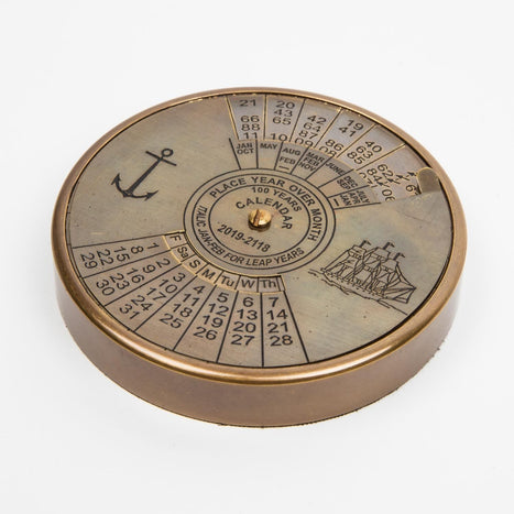 Take the long view with this incredibly unique calendar, a fascinating and functional desk accessory that puts a century of dates at your fingertips. Crafted from brass with an antique finish, this durable and eye-catching calendar allows you to find the day of the week for any date between 2019 and 2118. Simply rotate the dial to align the month and year, and the calendar reveals the corresponding days; no batteries or updates required! An outstanding gift or conversation-worthy addition to any office, it’s the perfect blend of practicality and timeless design. Handcrafted in India.