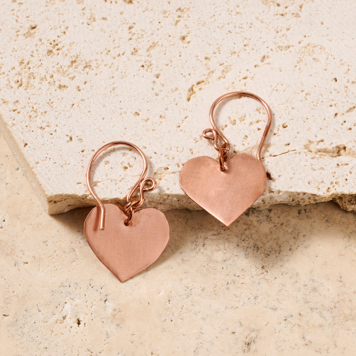 You'll fall in love with these delightfully styled earrings! Made from 100% copper with a protective coating, these drop earrings feature a simple yet charming single heart design. The copper hook adds the perfect finishing touch. A versatile and fashionable accessory that will highlight any look. A Ten Thousand Villages Exclusive handcrafted in Chile.