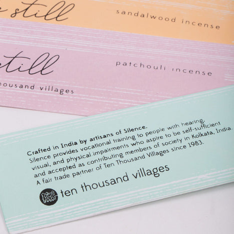 Be still. Enjoy the richness of the amber-scented incense from India. In a country where stable employment is scarce, people with disabilities rarely find work; Silence provides vocational training and employment, empowering people with hearing, visual, and physical impairments.