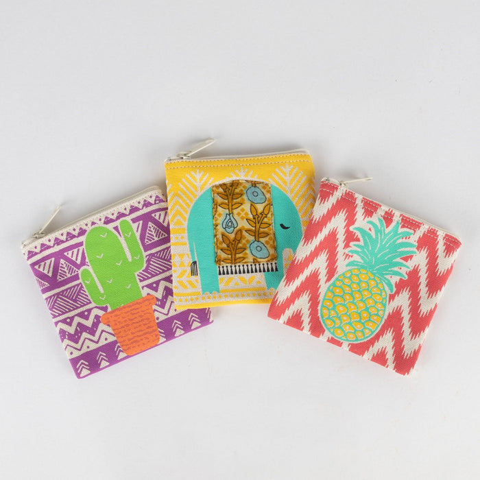 Coins corralled, a mini hygiene pouch for lip balm, tissues, a small hand sanitizer, napkins, or an on-the-go crayon case with a mini pad for car rides and dinners out. Ready to hold whatever tiny needs you've got securely zipped inside. Handcrafted by artisans, mostly women, with Saidpur Enterprises, who receive literacy, nutrition, legal rights, and finance training as part of their employment.
