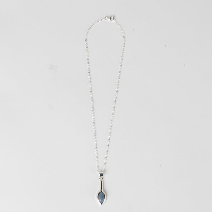 The Celestial Silver Marquise Pendant Necklace features a stunning marquise-cut pale blue celestine stone set in sterling silver. Celestine is believed to help the wearer in mindfulness practices, like meditation and prayer. This stunning pendant necklace is handcrafted by artisans in Peru with Allpa.
