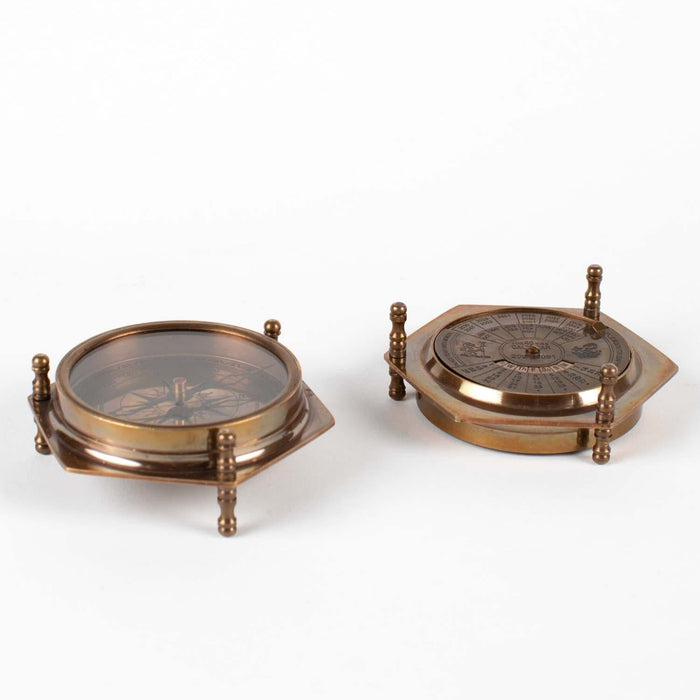 • Compass on one side and 40‒year calendar (starting in 2021) on the opposite side. Three antiqued oxidized brass posts/feet (measuring a total of 1.5H inches) are positioned to keep the compass/calendar elevated from table surface.