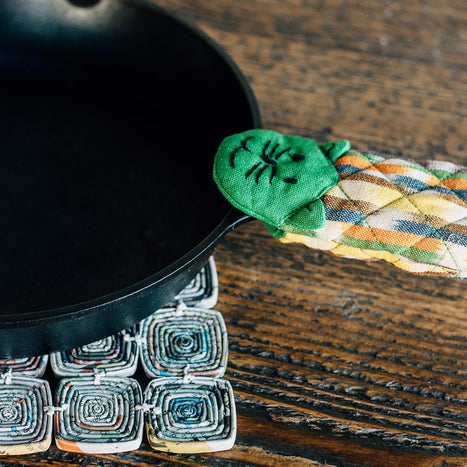 Colorful kitten keeps your hand safe from hot pan handles. Handmade in Guatemalan cotton.
