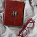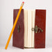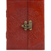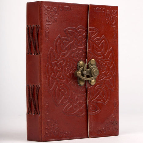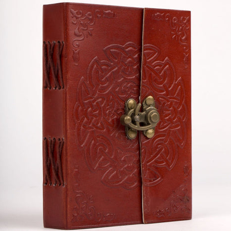 • Leather-bound journal with embossed knot design on front and back and antiqued brass closure