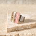 Get ready to make a statement with this amazing ring! This stunning piece features square fused glass in shades of pink, white and gold attached to an adjustable surgical steel band. An elegant and sophisticated choice that's sure to elevate any look! A Ten Thousand Villages Exclusive beautifully handcrafted in Chile.