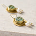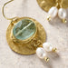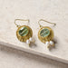 Embrace the balancing power of fluorite with these stunning earrings! Rich with detail, this exquisite jewelry features a shiny brass disc with wire-wrapped sea green fluorite - a stone renowned for properties promoting clarity and calm - and two petite dangling pearls. A Ten Thousand Villages Exclusive handcrafted in India by our fair trade partner Tara Projects, which helps to transform artisans' lives and communities with new opportunities to earn sustainable income.