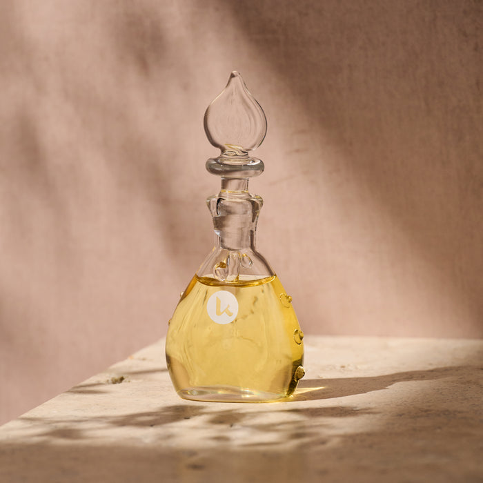 This seductive and warm fragrance features notes of bergamote, muscadete, fleur blanche, nagarmota, patchouli, vanilla and other French essential oils perfect for anyone with a sophisticated taste. Developed with the assistance of experts in Grasse, the world's capital of perfumes, and free from alcohol, dyes and artificial scent. Gorgeously presented in a handblown bottle wrapped in black paper and sealed with wax, this fragrance is a true luxury experience. Includes an exquisite handblown glass heart that can be worn as a necklace or bracelet to wear as part of the fragrance experience or gift to someone special. Handcrafted in Egypt.
