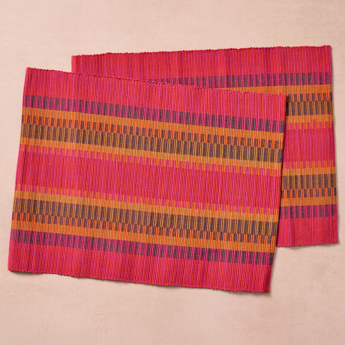 Bring a sense of classic style to your dining experience with this timeless set. Made of 100% cotton, this set of two placemats adds a touch of elegance and warmth to any table setting. Featuring a pink, orange and brown striped design, these handloomed mats are durable and easy to clean. Elevate your meals with these must-have placemats! A Ten Thousand Villages Exclusive handcrafted in Nepal.