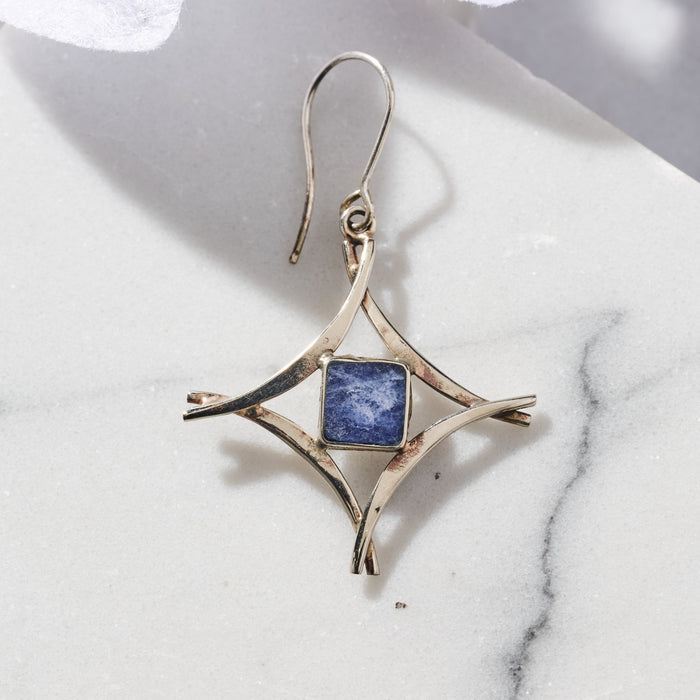 Embrace a new angle of beauty with these fabulous earrings! The rhombus shape and vibrant sodalite stone evoke a sense of sophistication and elegance. Made with alpaca metal and sterling silver hooks, these silver and blue dangle earrings are a perfect addition to any outfit. Handcrafted in Peru.
