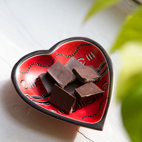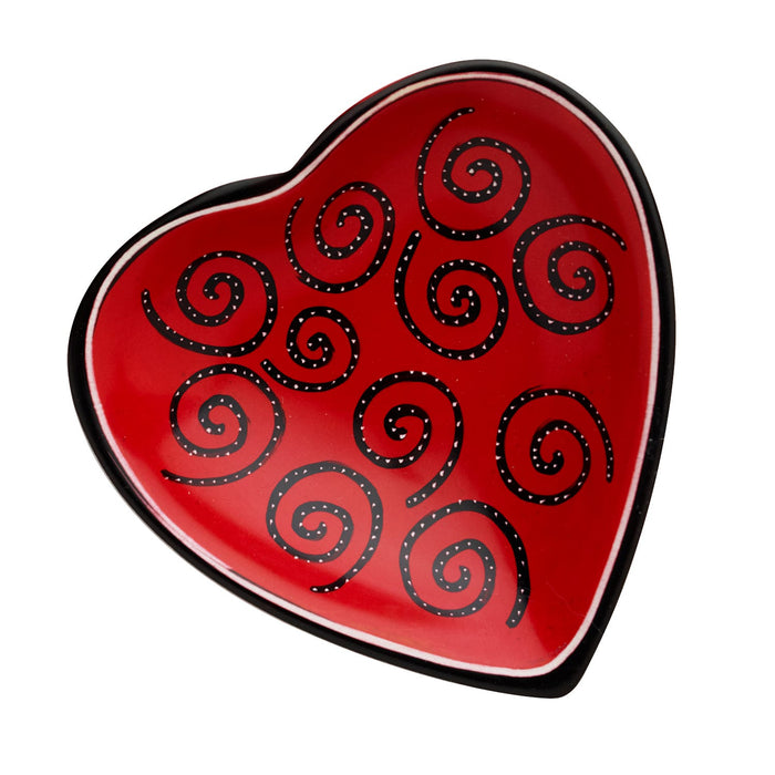 Red heart dishes painted in an assortment of designs are a wonderful way to display candies or trinkets. Found only in Kenya, kisii is a soft stone that can be carved into graceful shapes. Its satiny finish is achieved through multiple stages of sanding, followed by waxing.