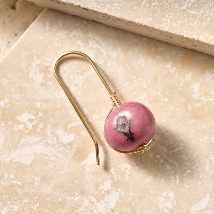 Enhance your style with these delightful earrings! Each one features a lavender acai seed wrapped in a 14K gold wire drop that hangs from a hook, creating a unique and elegant look. Made with natural materials, these earrings add a touch of bohemian charm to any outfit. A Ten Thousand Villages Exclusive handcrafted in Colombia.