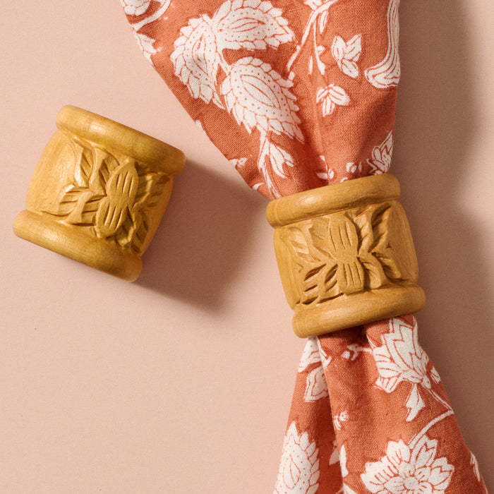 Bring a touch of simple elegance to your table setting with these beautiful napkin rings. Made from high-quality Haldu wood, these rings feature a carved lotus blossom design and are a gorgeous natural wood color. The set of two are tied together with jute string adding to the rustic charm. A Ten Thousand Villages Exclusive handcrafted in Nepal.