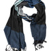 The Lunar Eclipse Scarf features color blocks of solids and stripes in shades of blue and blue-green on a black background—like moonlight, coming and going. This viscose scarf has 2" of twisted fringe details on both short ends.