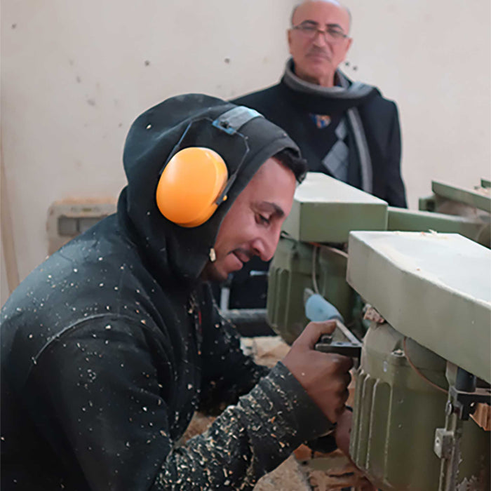 Raja Bannoura Workshop, based in Beit Sahour, a village on the east side of Bethlehem, produces hand-carved olive wood products. Bannoura coordinates orders for many olive wood carvers and workshops in Beit Sahour. He collects pruned olive branches and wood, stacks them in his yard, and dries them for six to nine months before cutting the wood for use. Laminating many small rectangular pieces together makes the larger flat pieces for nativities. Using small pieces of wood ensures that olive trees are not cut down for carving purposes. Raja Bannoura began working with olive wood in his family workshop in Beit Sahour in 1974. Ten Thousand Villages has purchased products from Raja Bannoura since 1978.shepherds-field-workshop