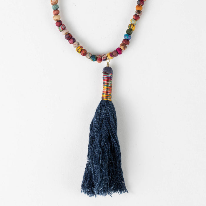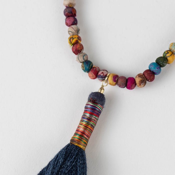 Naturally elegant, the Jhabbe Tassel Pendant Necklace is handcrafted from denim thread and organically shaped recycled sari beads for laid back beauty. Due to the resourceful reuse of recycled saris to make the beads, colors and patterns vary, making each one a beautiful and unique handcrafted piece. This sustainable practice also means less fabric is sent to the landfill. A unique necklace to add to your jewelry collection.