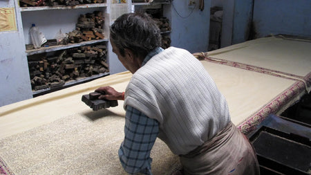 As beautiful on as it is hung in your bathroom or closet, the Paisley Cotton Robe is a work of wearable art that dates back to ancient times. It's a highly skilled and labor-intensive method of hand-printing fabric. The artisans first carve a wooden block, one for each color in the pattern. Dyes are often mixed from foraged plants, then they sketch the cloth with the design, then carefully imprint it with the block. The printer moves from left to right, with the dye on the design block stamping it onto the cloth. This is repeated to cover the entire cloth with the intended design and colors. Then they lay it in the sun to dry.