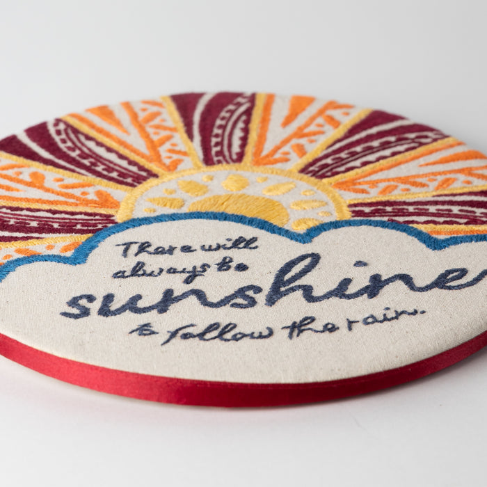 This beautiful piece of wall art is a hope-filled reminder that tomorrow is another day. Embroidered with vibrant sunbeams and the outline of a cloud, this special piece reminds us that "There will always be sunshine to follow the rain." Keep to brighten your own space or gift to a friend or family member. Hangs by the frame on your hook. A Ten Thousand Villages Exclusive made in Gomtipur, Ahmedabad, India by St Mary's Mahila Shikshan Kendra, a women’s handicraft association that creates embroidery in the age-old tradition of the Kathiawadis. Created by the Dominican Sisters, St. Mary’s operates a dispensary and maternity clinic plus health, savings, sewing and children's education programs.