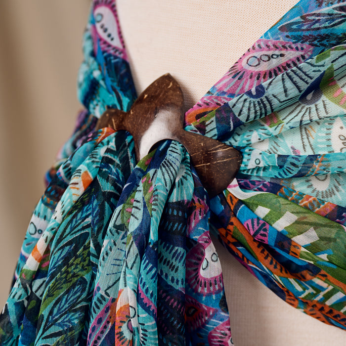 Shaped like a radiant star and carved from natural coconut shell, this eco-friendly sarong and scarf holder adds a touch of island charm to any outfit. With dual center openings to effortlessly secure your wrap or scarf, it’s the perfect blend of beauty, function and sustainable style. Handcrafted in India.