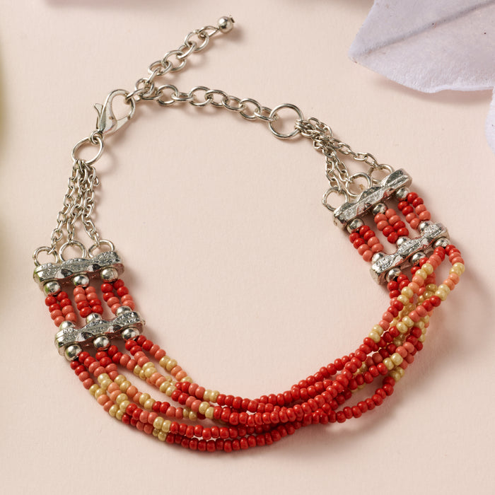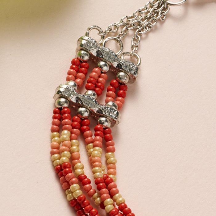 This stunning piece features six strands of beautiful glass beads accented with metal bars and chains for a unique touch. The lobster claw closure and adjustable links ensure a perfect fit. The warmth of the terracotta hues against silver creates a striking fashion statement that will enhance any outfit. A Ten Thousand Villages Exclusive handcrafted in India.