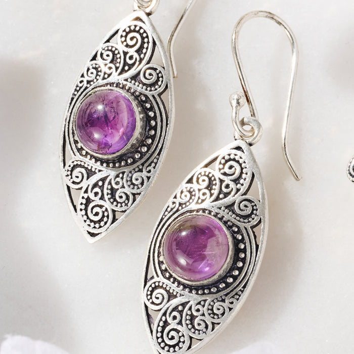 These amethyst earrings will make a stunning addition to your jewelry collection. Made of brass with silver oxidized electroplating, the dangle design features a pointed ellipse shape and a dazzling, purplish-blue amethyst stone. Simply styled yet elegant earrings that add a regal touch to any outfit! A Ten Thousand Villages Exclusive handcrafted in India.
