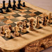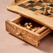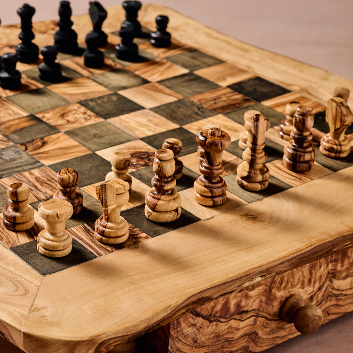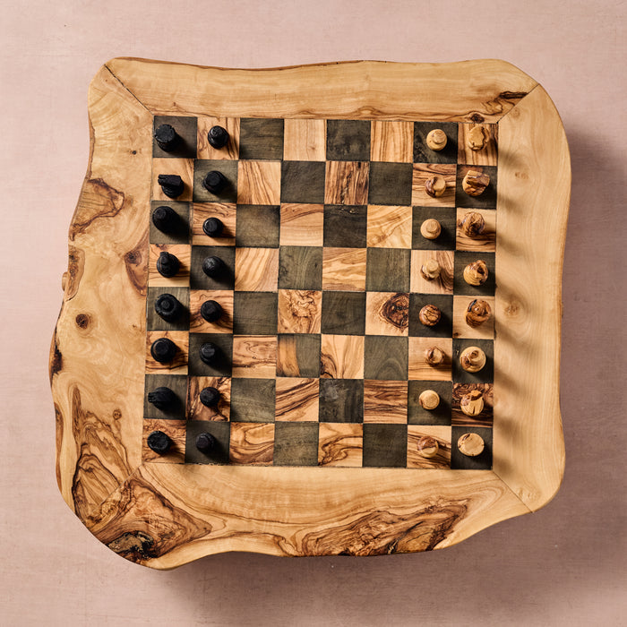 Art meets strategy with this stunning organic-shaped wooden chess set. The naturally asymmetrical top, inspired by the flowing lines of a tree, frames a striking black and natural brown checkered inlay at its center. Resting on four sturdy wooden feet, the board features hidden drawers on each side to neatly store the matching chess pieces. A true blend of nature, craftsmanship and timeless play. Handcrafted in Tunisia.