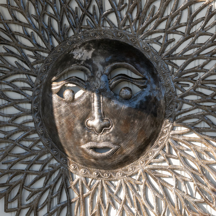 Bring the radiance, power and beauty of the sun indoors with this magnificent wall hanging. Handcrafted from upcycled oil drums, this sun features a face with root-like rays and a natural, metal finish that adds to the rustic feel. Elevate the style of any room with this unique piece of art that will surely inspire and energize. Handcrafted in Haiti.