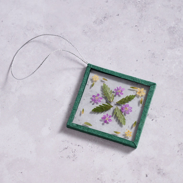 Reminiscent of peering out at the coming Spring, this framed "windowpane" ornament is an enchanting departure from traditional holiday tree decor! Real dried leaves and flowers are artfully arranged and pressed between two squares of glass and finished with a vibrant green rice paper trim. Includes a silver twisted cord hanger that makes a captivating presentation dangling from your tree! A Ten Thousand Villages Exclusive handcrafted in the Philippines by artisans working with Salay Handmade, an organization that provides development assistance, pensions and profit sharing to makers in the community of Salay, an area with little industry and a history of political unrest.
