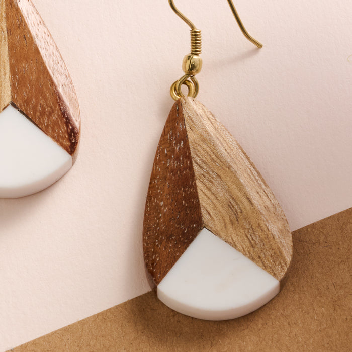 Crafted with acacia, mango and resin, these dangle earrings feature a unique blend of materials that create a stunning look. The teardrop shape is divided into three sections, adding depth and dimension to your ensemble. The brown and white color scheme is complemented by gold brass hooks for a touch of elegance. A Ten Thousand Villages Exclusive handcrafted in India.
